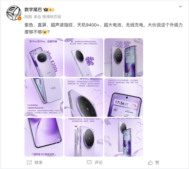 vivo X200s此次的外观相当出彩,4种时尚配色,包括淡紫色、薄荷蓝、直白和简黑,搭配6.67英寸的2.5D纯直屏,再加上极窄的边框,视觉效果非常出色。据博主数字尾巴爆料,此次新机采用AG玻璃后盖,搭配阳极氧化铝合金中框,将柔美与雅致具象化,而且握持感相当舒适。